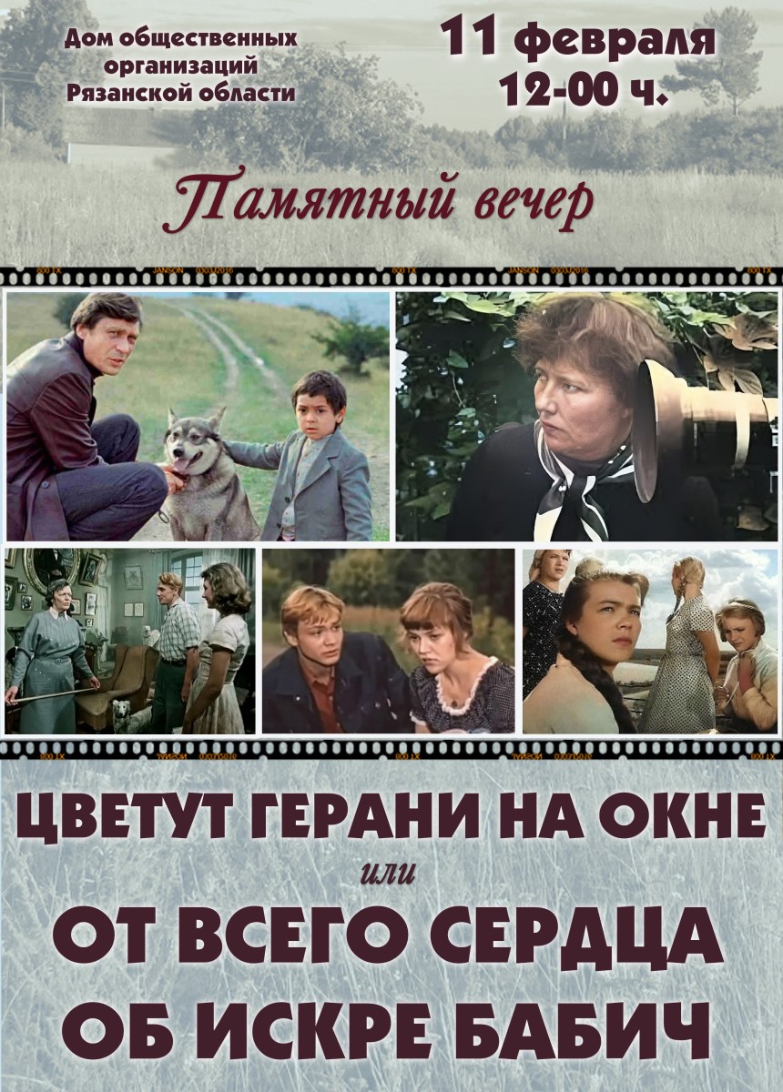 11 февраля в Доме общественных организаций состоится памятный вечер «Цветут герани на окне или от всего сердца об Искре Бабич», посвящённый замечательной женщине, Искре Леонидовне Бабич, — советскому и российскому кинорежиссёру и сценаристу.